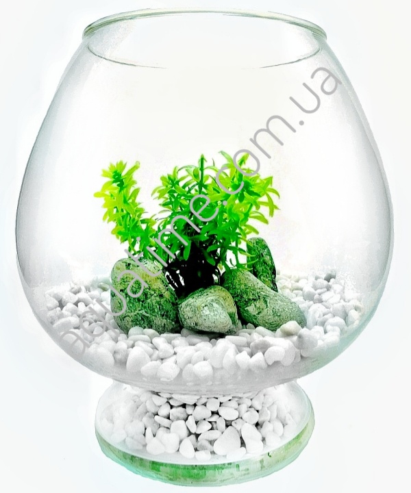 У комплекті: акваріум-келих, рибка Півник, ґрунт (білий мармур), камінчики (зелений мармур), рослина, корм на 5місяців, інструкція по догляду за рибкою Півник, вода.